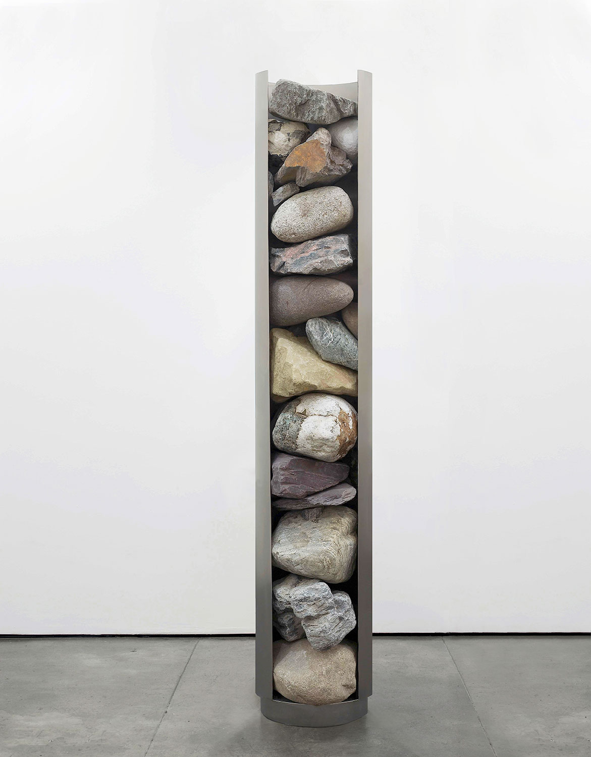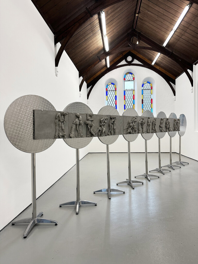 In the foreground: Nicole Wermers, The Long Hello, 2018. From the left: Marcello Maloberti, Martellate, 2020; Corita Kent, digital projection of photographic image, ca. 1950—1969; Andreas Angelidakis, DEMOS Gold Bar, 2018; Nora Turato, the world is like a cactus, its impossible to sit down, 2019.