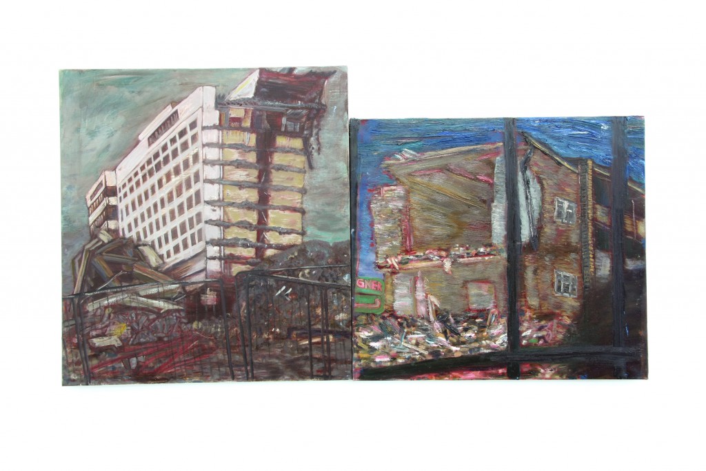 Seit 2013 arbeitet Gustav Kluge an der Serie der Abbruchhäuser, deren meisten Motive einen konkreten örtlichen Bezug haben. Die Doppeltafel Meeting (Interconti-Nizzapalais) (2014) erfasst auf der linken Tafel das ehemalige Hotel Interconti in Hamburg in der Mitte des Rückbaus. Die rechte Tafel zeigt das Nizzapalais. Die Abbruchflächen der beiden rückgebauten Architekturen sind einander zugekehrt. Sie verweisen auf die vielen medialen Bilder von Hausruinen, die oft nur schwer unterscheidbar Kriegsfolgen, Naturkatastrophen und Stadterneuerung dokumentieren.