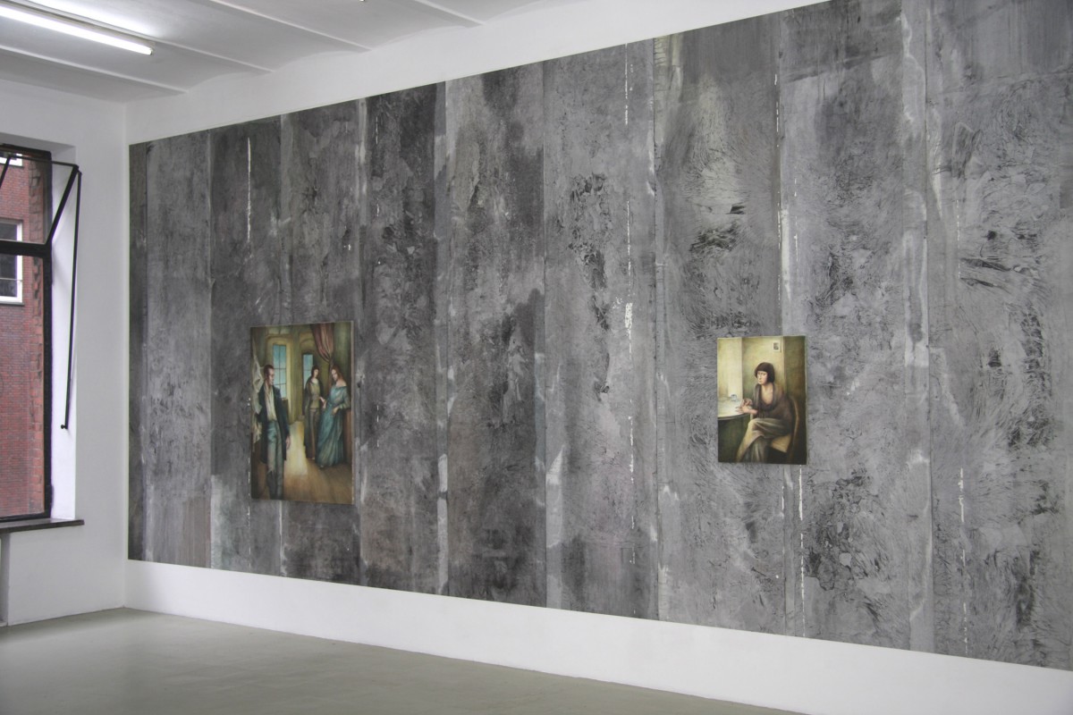 The works are glazed on traditional chalk-ground canvases. They are characterized by a peculiar light and sensitively applied shades. Within their subdued colour spectrum the play of higher and darker tones dominate the compositions. The architectonic details, crease-like lines, and fragments of landscape set the stage for this play. As he did in a recent show, Brungs created an interactive installation between his works and the exhibition space itself: he placed coloured paper surfaces as compositional elements on the gallery walls, referencing wallpaper. The designed layers then come together as a kind of wall painting. Against these subdued grey tones, the colours within the actual paintings seem to glow. In light of this formal detail, the content of the single paintings fall into the background. Nonetheless it is the content Brungs transports with a specific emotionality that is native to the medium of painting and central for Brungs’ overall oeuvre. Specifically here, scenes from the life and milieu of poets Else Lasker-Schüler and Georg Trakl are situated somewhere between fact and imagination. For Brungs this is a continuation of an interest that has already lead to a few groups of works. Particularly, it’s the last cycle, Mauvais Sang – Bad blood, which included paintings that dealt with fictitious meetings of prominent people , most prevalently those in literary history, who were situated in the epoch of symbolism at the threshold of capitalist modernity.