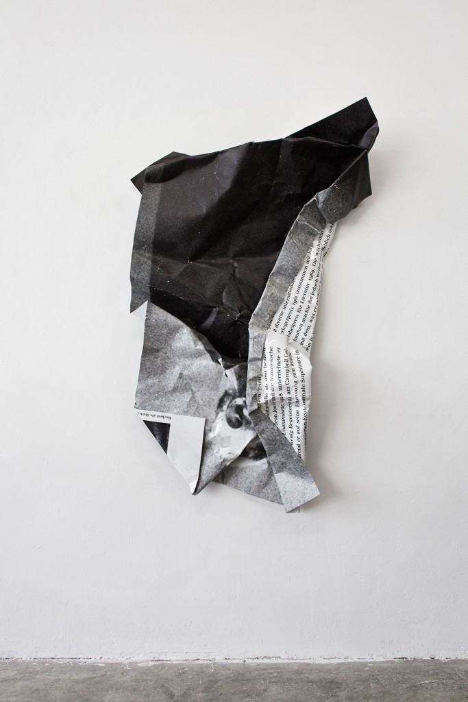 Since 2010, Olaf Metzel has worked on wall-based sculptures made from double-sided, printed aluminium sheets, which he manually distorts so that they appear as oversized balls of discarded newspaper. Articles from papers, magazines and books, across the spectrum of themes, from art and culture, through politics and sport, to popular music, are used as the source material for the sheets. Often, the themes are those heavily discussed in the media and relevant to society, those that have dominated the media landscape for a time. Examples might be the civil unrest and protests in Turkey, the tristesse of the urban housing situation in the Berlin prefab estates, or the art forgery scandal centering around Werner Spieß. Other wall-based sculptures function as media portraits of famous personalities both from the pop and entertainment industries, as well as the cultural scene: Amy Winehouse, Jimi Hendrix, the racing driver Jochen Rindt, Susan Sontag, Gottfried Benn and Rainer Werner Fassbinder have all been the subjects of such portraits.[1]
