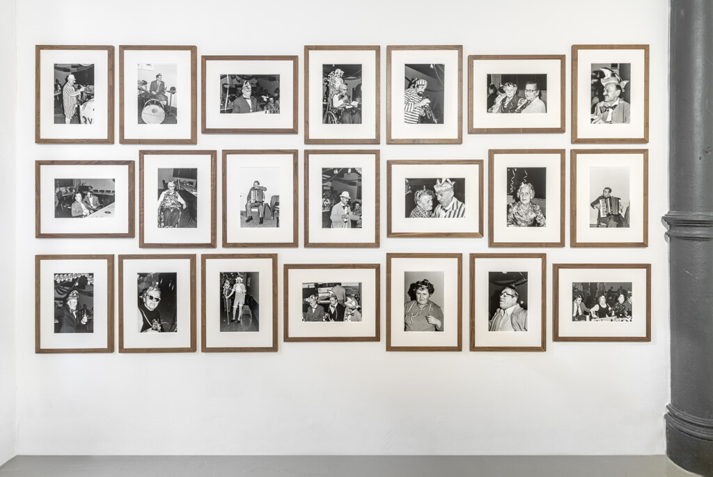 Die gleichnamige 79-teilige Fotoserie Karneval im Altersheim von 1974/75 bildet dabei den Mittelpunkt der Ausstellung. Die Fotografien im Format 38 x 28 cm sind während seines Zivildienstes von 1974 bis 1975 mit einer Pentax-Spiegelreflexkamera entstanden. Schütte, der damals schon drei Semester an der Düsseldorfer Kunstakademie bei Fritz Schwegler studierte, musste sein Studium für den Zivildienst in einem Altersheim am Niederrhein unterbrechen. Die Bewohner:innen des Altersheims waren vor allem viele ehemalige Fremd- oder Zwangsarbeiter der Nachkriegszeit, Vertriebene und wenige Bauernwitwen. Über den Verlauf seines Zivildienstjahres hat er von jeder Person im Heim ein Porträt aufgenommen, insgesamt 14 Filmstreifen sind das Ergebnis. Als Zufallsfund sind ihm nach 50 Jahren im Frühjahr 2025 diese Aufnahmen wieder in die Hände gefallen. Es ist wie ein Blick in ein Fotoalbum – berührende Porträts aus einer vergangenen Zeit, die auch die eigene Vergänglichkeit sichtbar machen und die aktuelle Debatte um die Wehrpflicht oder den Ersatzdienst thematisieren. Im Steidl Verlag ist in diesem Jahr der begleitende Bildband mit einem Text von Thomas Schütte dazu erschienen.
