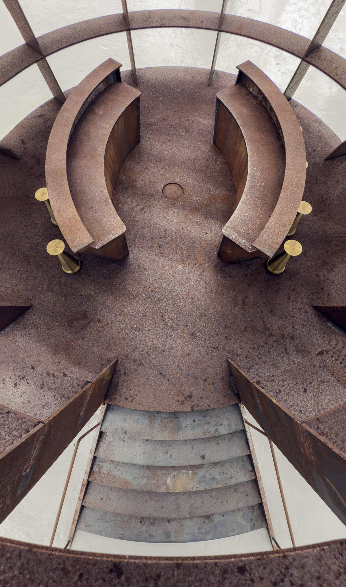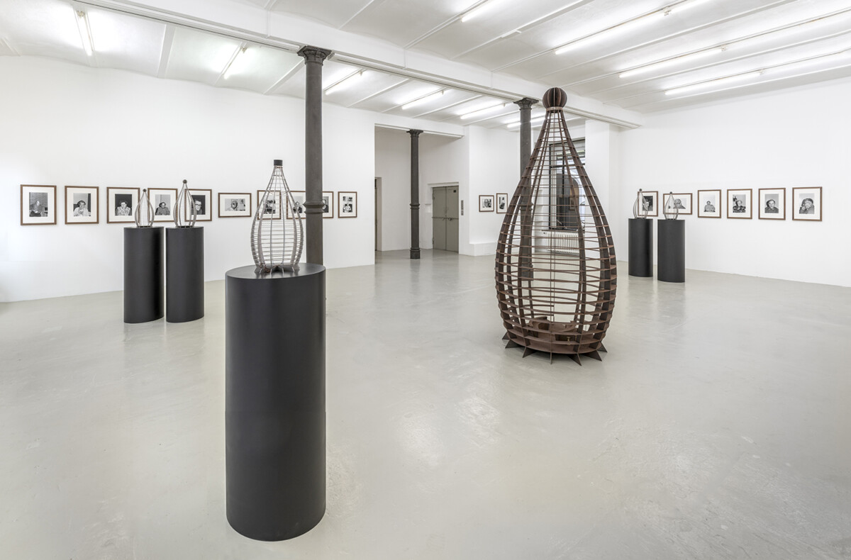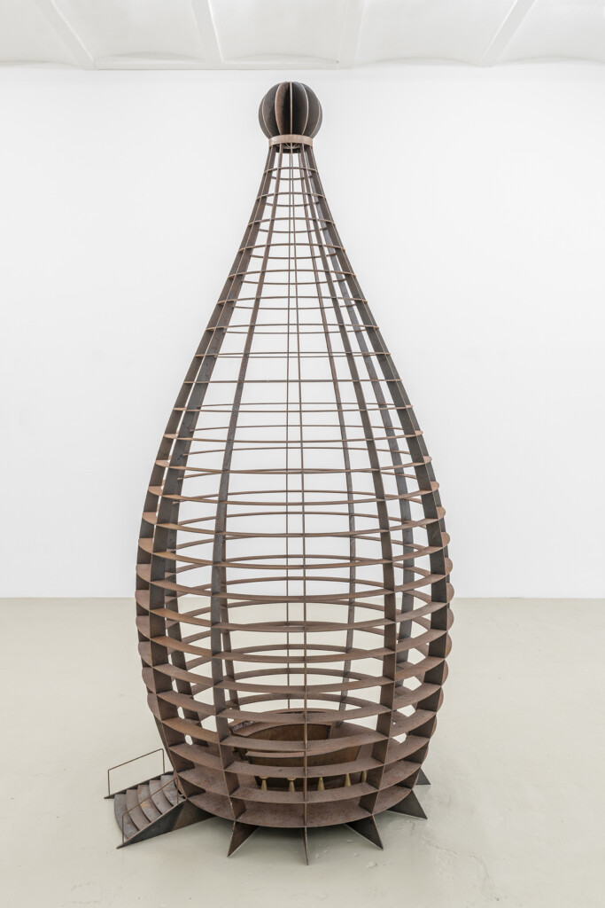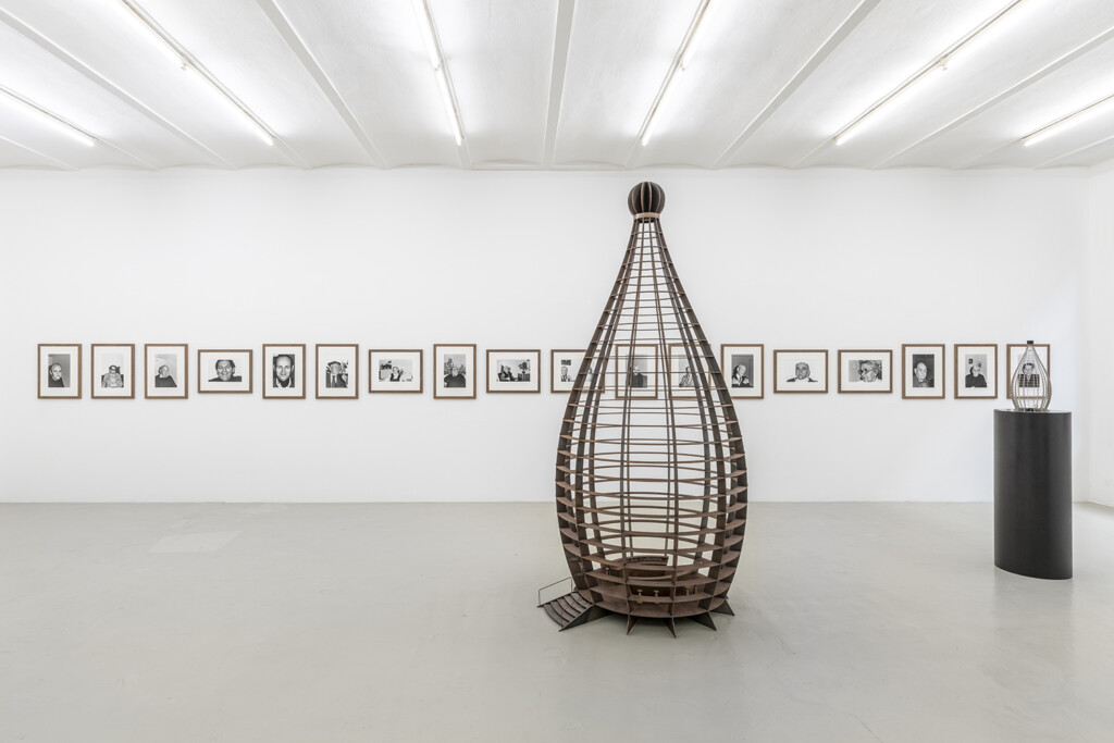 The exhibition space also features six models of the Tower of Talkers. These models, which vary in scale and material, date back to 2006, when Schütte won the competition for Art on the Cultural Mile in Hamburg’s HafenCity with these Tower of Talkers. His design envisaged two 30-meter-high sculptures for the HafenCity as an extension of the art mile. The models show a convex, airy structure tapering to a point at the top, with a cathedral-like height, similar to a birdcage. The base plate of the original design is equipped with a café and bar with counters arranged opposite each other. The walk-in structures were to be located on an artificially created island utopia, in the vicinity of Baakenhafen and next to apartments, shops, a school, offices, and restaurants.