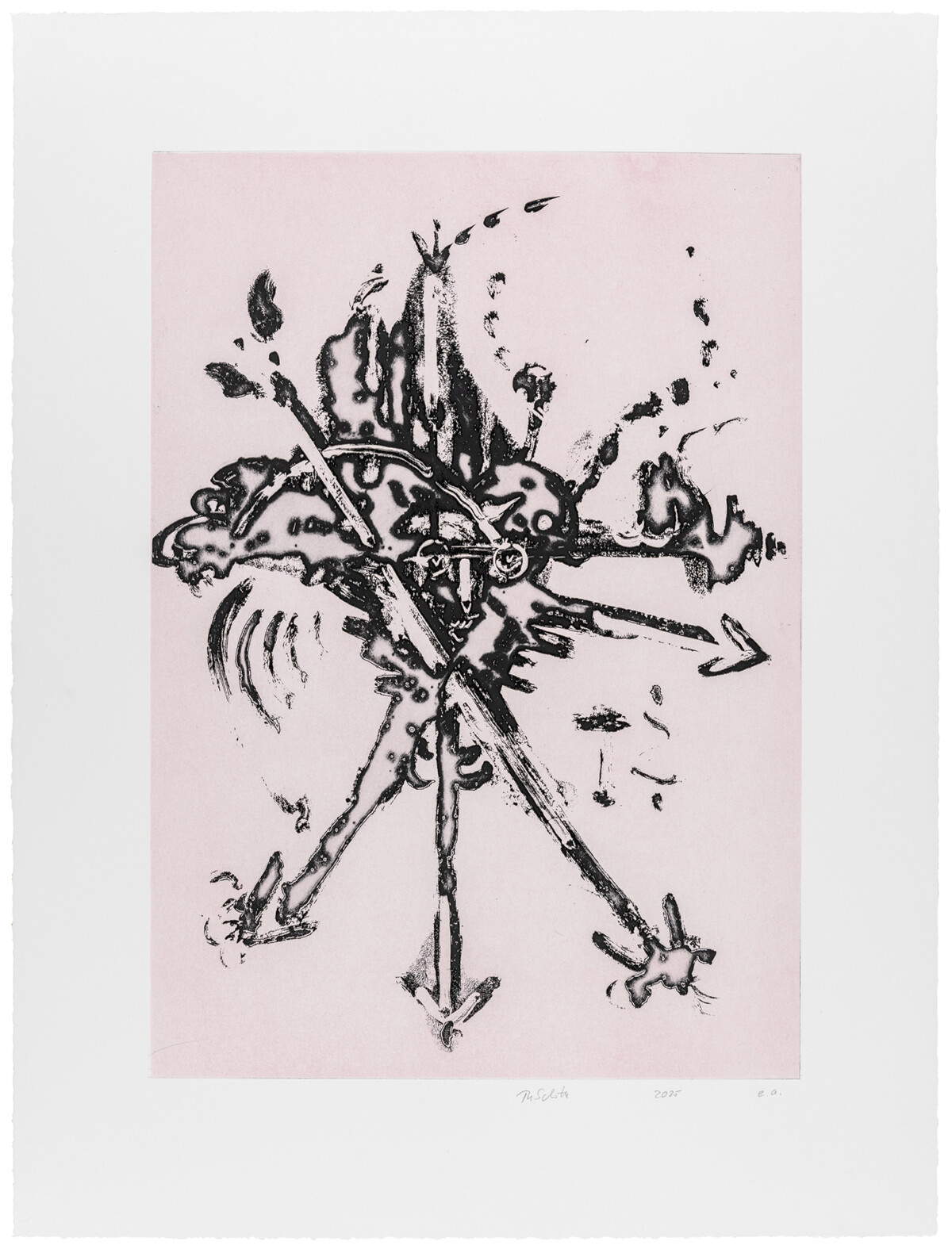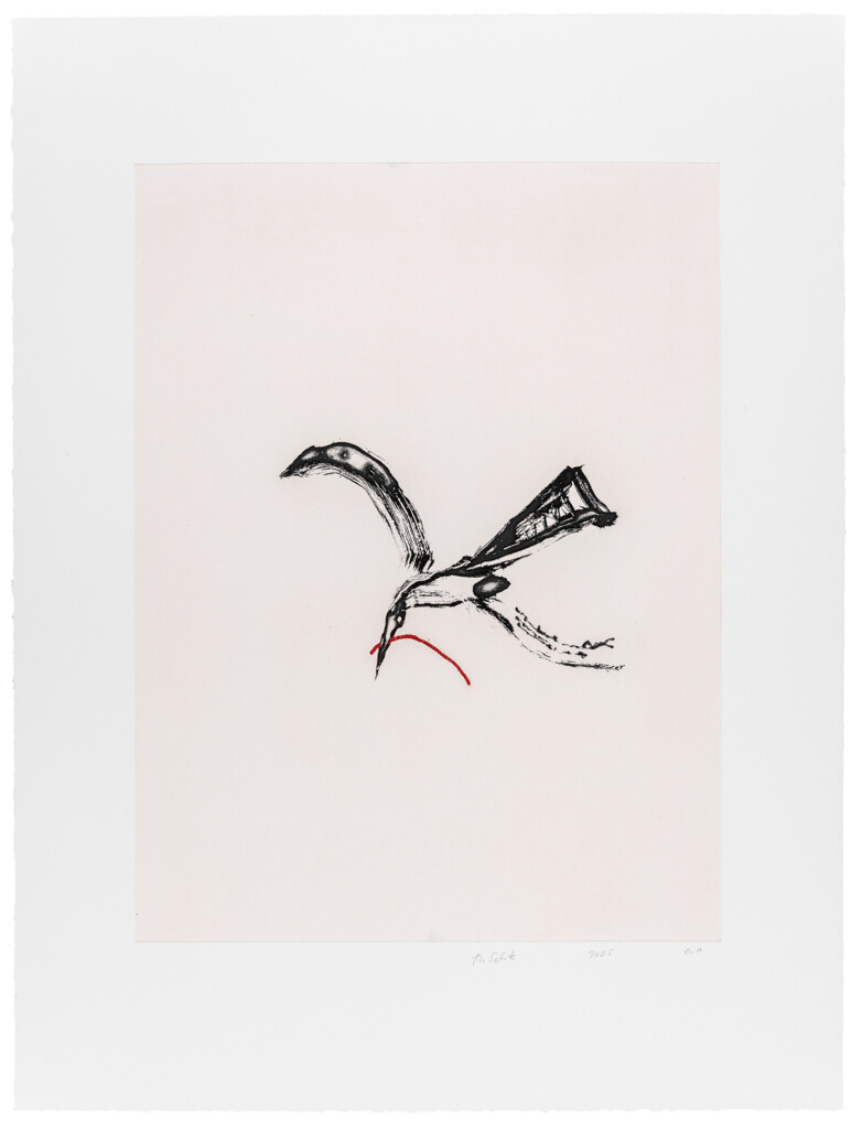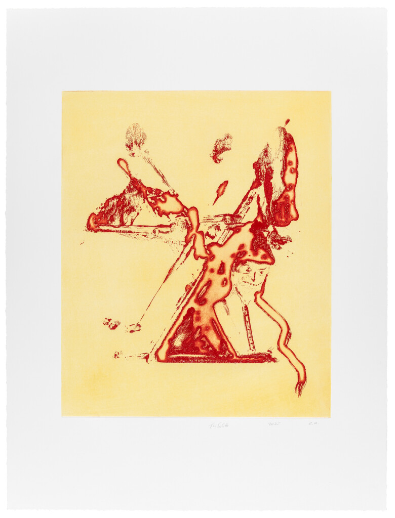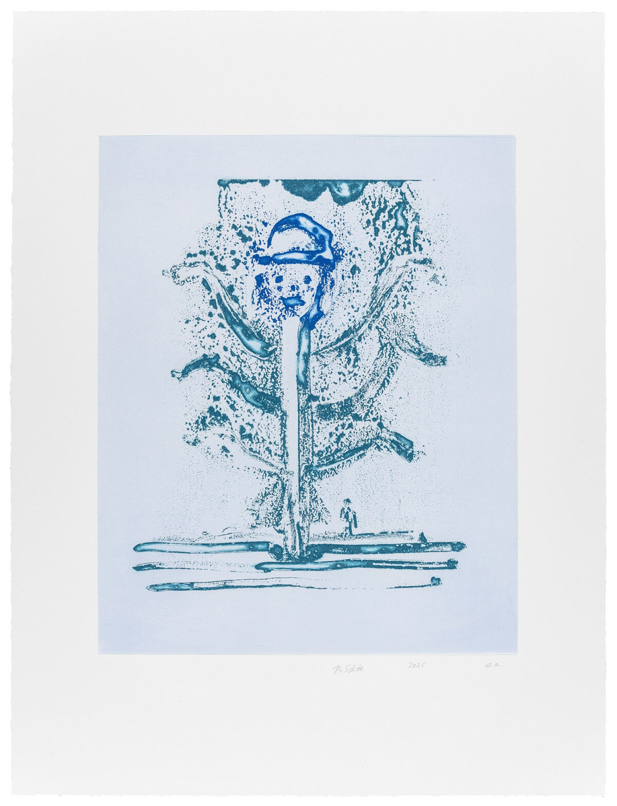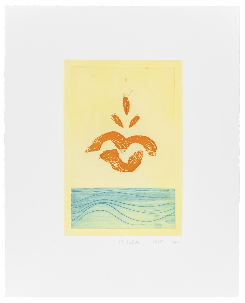 For 25 years, Thomas Schütte’s printmaking work has been created in Wedel near Hamburg in Till Verclas’ former print workshop, which is now run by Lars Dahms and Daniel Vogler. In 2024, the Skulpturenhalle in Neuss / Thomas Schütte Foundation presented the extensive printmaking oeuvre in its entirety for the first time in an exhibition. What began in 2001 with the colour etching series Wattwanderung opened up new and previously unknown possibilities for Schütte in the intaglio printing process. In 2025, two new colour portfolios, O.W. (groß) and O.W. (klein), each with 10 and 7 motifs respectively, were created using the intaglio printing process especially for this exhibition. O.W. is an abbreviation for ohne Worte (without words) and these etchings are to be understood as atmospheric images, based on a free, painterly style with figurative and landscape elements.